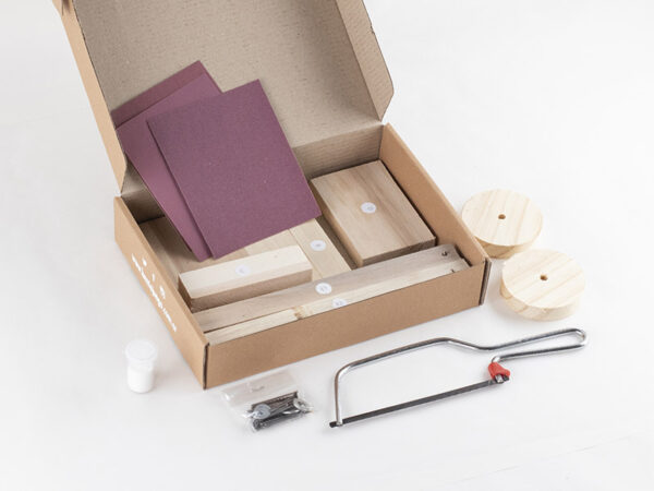 Kit de carpintería que incluye todos los materiales e instrucciones paso a paso para armar una carreta con maderas reutilizadas, es un proyecto ideal para construir entre adultos y niños